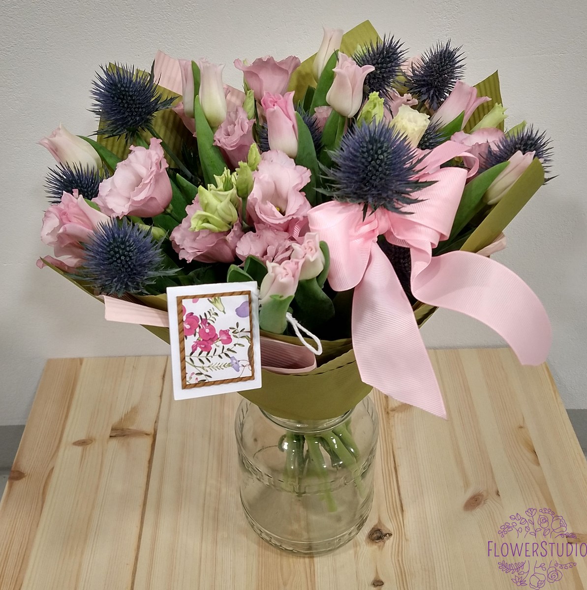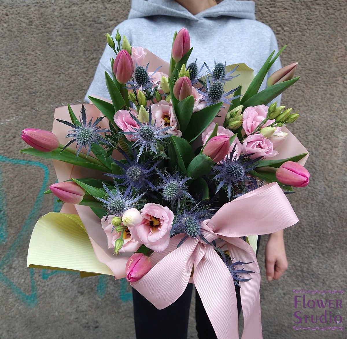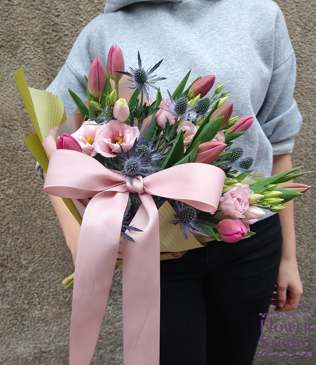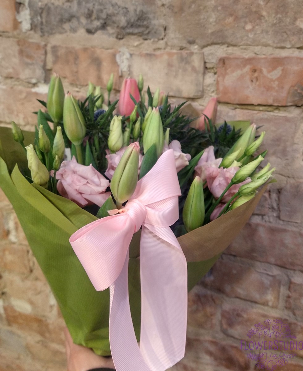Bukiet dla spragnionych wiosny, piękne tulipany z mikołajkiem oraz eustomą. Bukiet ozdobiony kolorowym papierem z elegancką kokardą